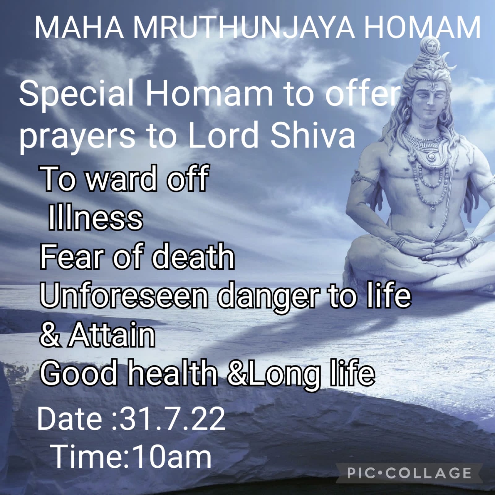 Mahamrutyunjaya homam is a Special homam/ Havan to offer prayers to Lord Rudra to ward off illness , fear of death , avoid unforeseen danger to life , give good health and long life.